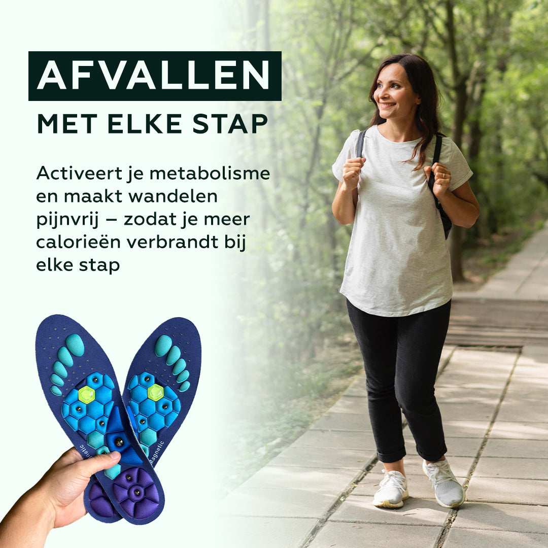 Elke stap die je zet kan je dichter bij je ideale gewicht brengen. De Viqore™ Magnetische Inlegzolen combineren acupressuur en magnetische therapie om je stofwisseling te activeren en vetverbranding te stimuleren – gewoon terwijl je wandelt.