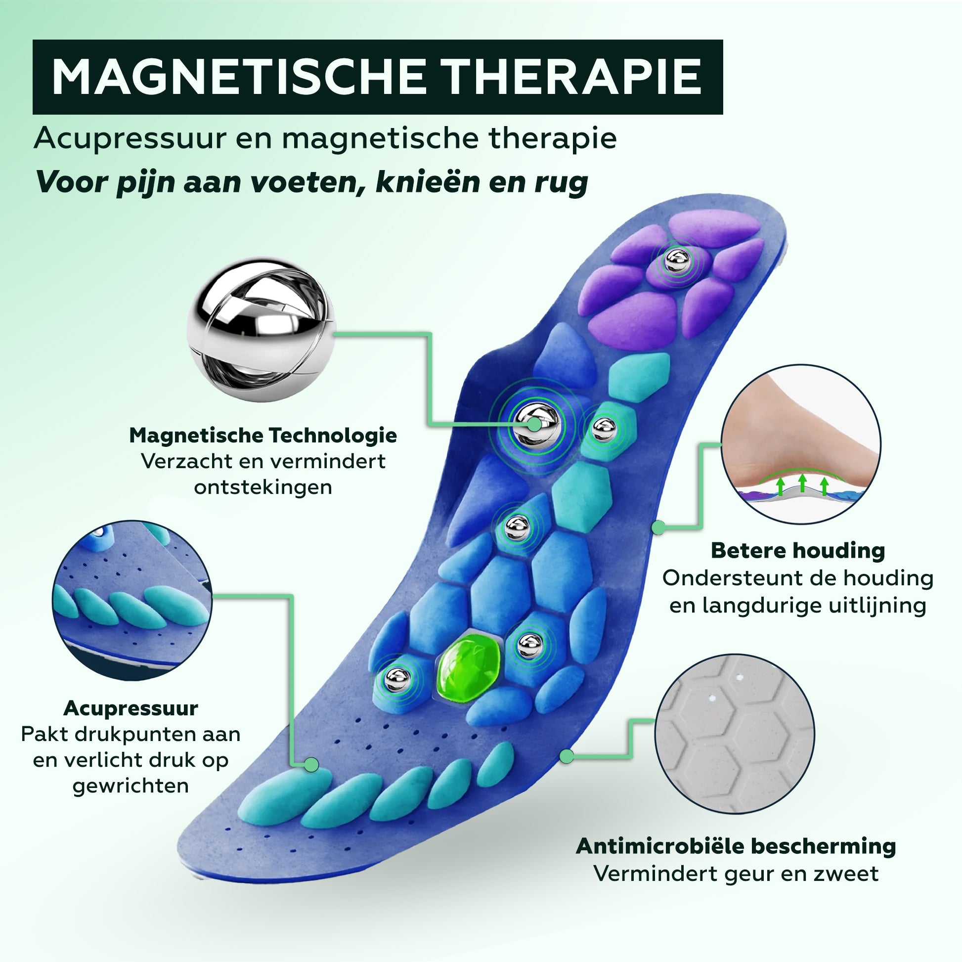 Onze Magnetische Inlegzolen combineren acupressuur met zachte magneten voor directe pijnverlichting en langdurige ondersteuning.