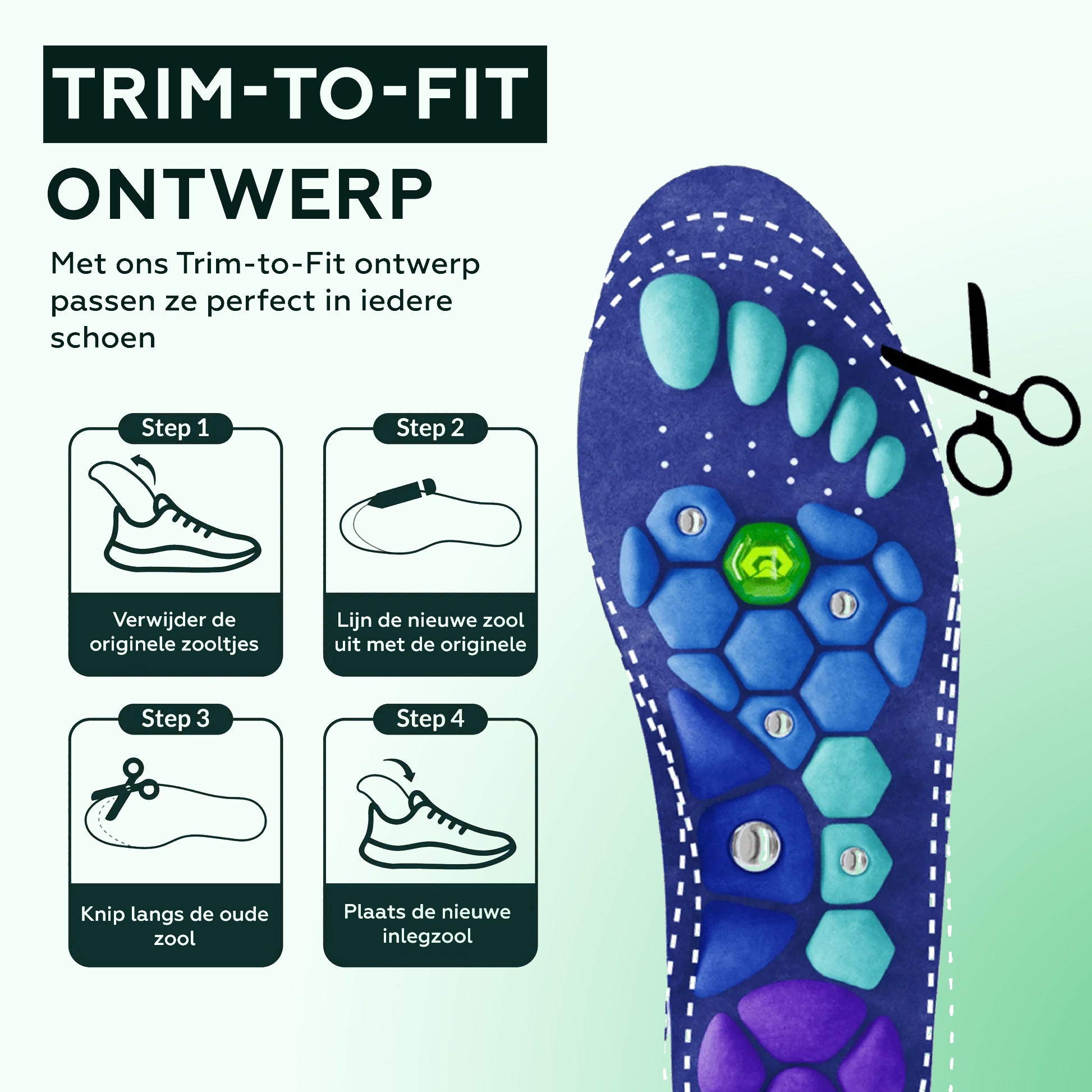 Knip de zolen langs de hulplijn op jouw maat, plaats ze in je schoenen (sneakers, werk- of wandelschoenen) en voel het verschil.