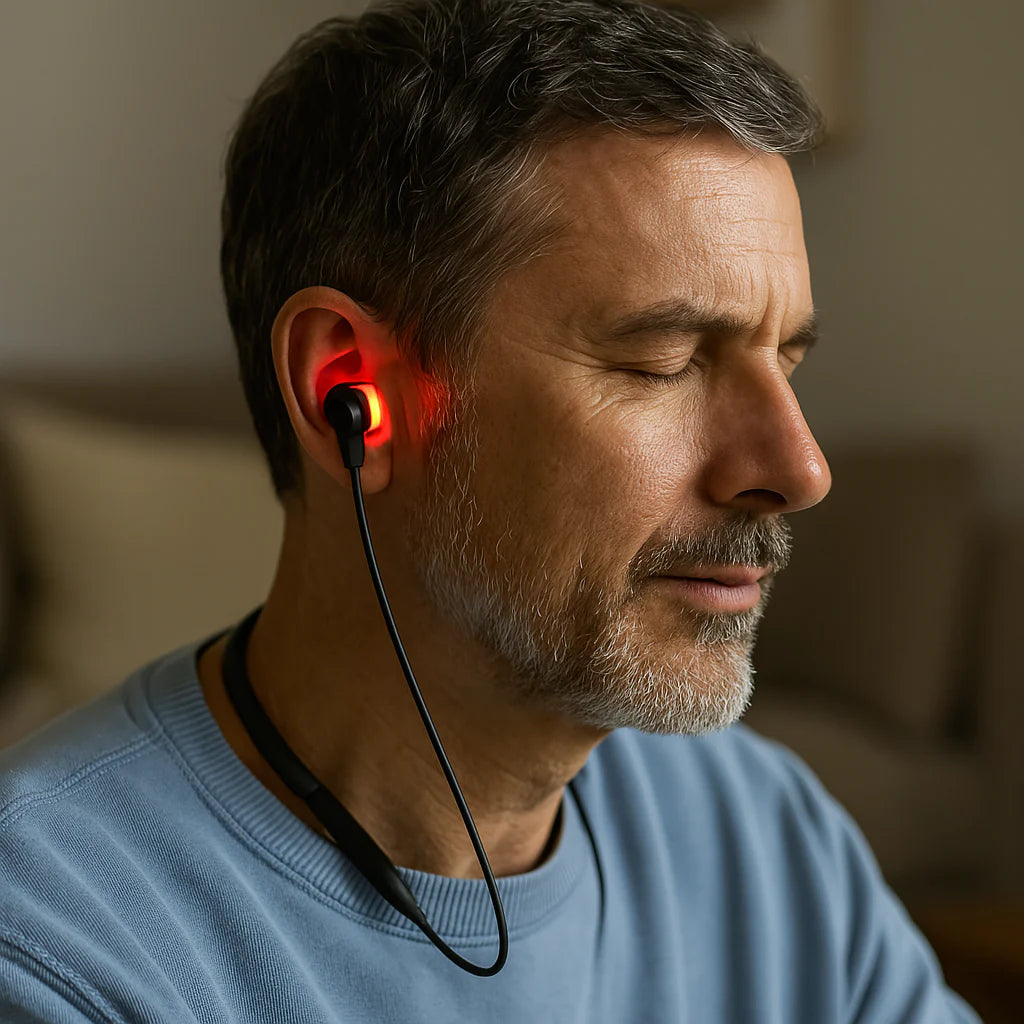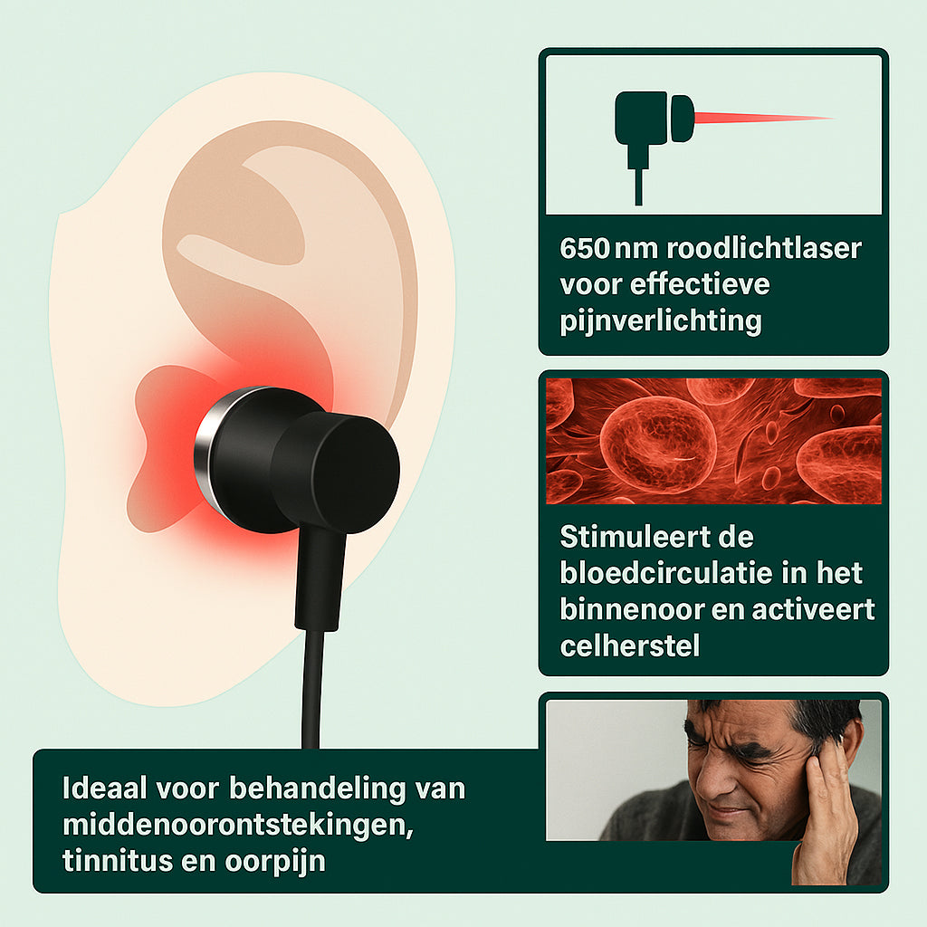 De innovatieve 650-nm roodlichttherapie verlicht niet alleen storende oorgeluiden, maar bevordert ook gericht de doorbloeding en regeneratie van je gehoorcellen.